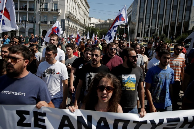 Διαδηλωτές φωνάζουν συνθήματα κατά την διάρκεια 24ωρης απεργίας από εργαζόμενους σε ξενοδοχεία και εστιατόρια, στην Αθήνα, στις 20 Ιουλίου 2017. REUTERS/Costas Baltas