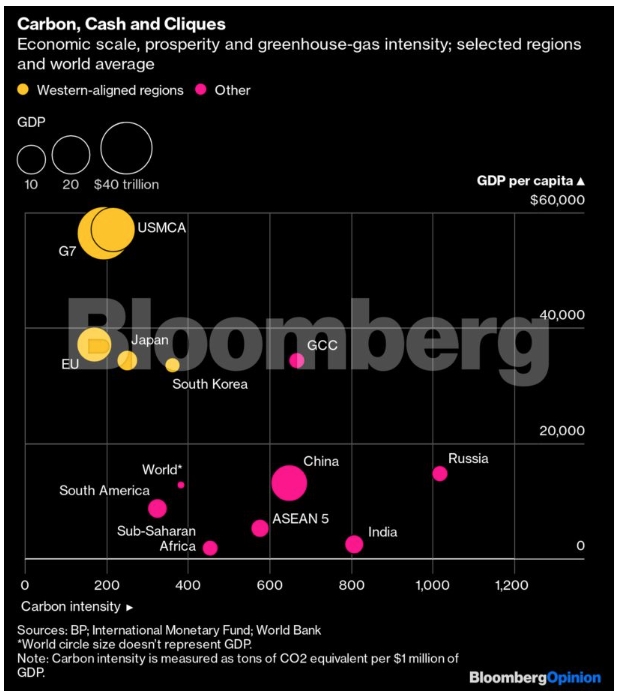 Κάτω από την ρητορική της πρόσφατης πολεμικής, οι συγκεκριμένες χώρες και περιοχές έχουν μερικά σημαντικά κοινά. Είναι όλες μεγάλες, ευημερούσες οικονομίες. Επιπλέον, με μια απόκλιση προς τις υπηρεσίες σε σχέση με την μεταποίηση και δεκαετίες προσπαθειών βελτίωσης απόδοσης πίσω τους, έχουν σχετικά καλή βαθμολογία όσον αφορά την ένταση εκπομπών αερίων του θερμοκηπίου. Το παρακάτω διάγραμμα - που επαναπροσδιορίστηκε από ορισμένα γραφήματα που δημοσιεύθηκαν πρόσφατα από την ClearView Energy Partners, εταιρεία ανάλυσης με έδρα την Ουάσιγκτον - συγκρίνει διάφορα μπλοκ και χώρες ευθυγραμμισμένες με τη Δύση με άλλες μεγάλες οικονομίες και ομάδες.